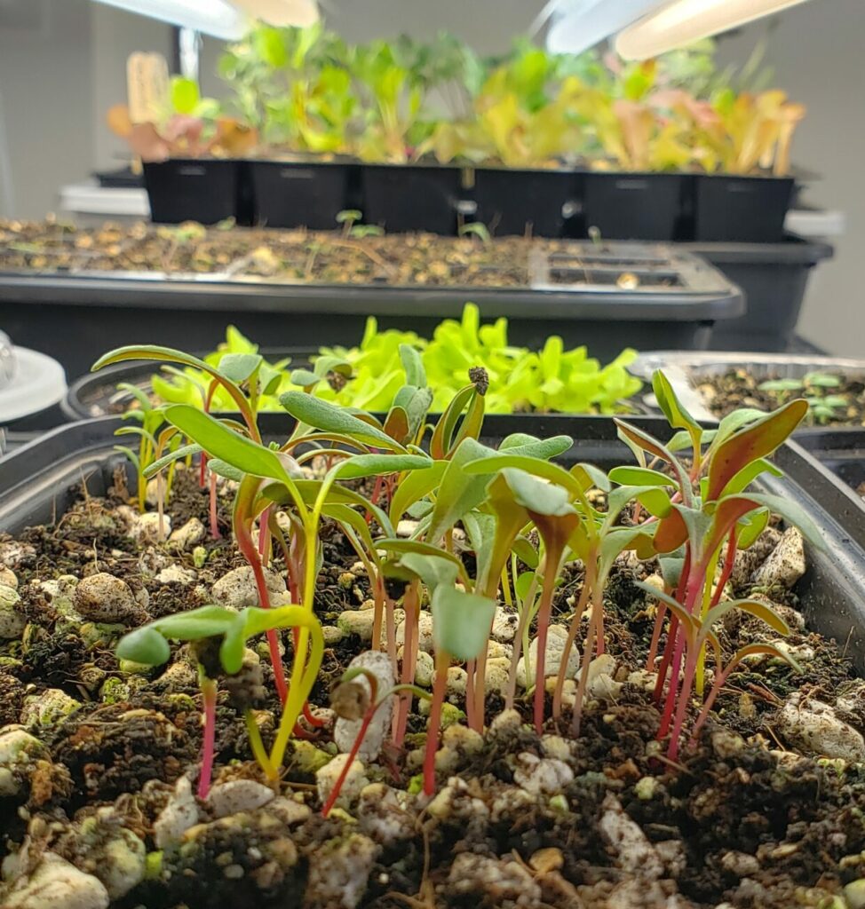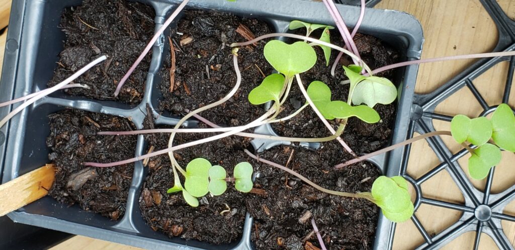 The opposite issue is allowing the soil to get too dry from too little watering. Seeds need to constantly be moist to aid in germination. Seed soil has really good drainage so it dries out quickly. Especially when growing indoors in the winter, the lack of humidity in the house will help the soil dry out fast. Seed sprouts are very small and don’t hold much moisture, so if the soil dries out, it doesn’t take long for the plants to die. If this occurs, water the soil and wait 24 hours. Some of the seedlings might bounce back.