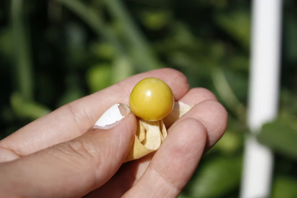The name ground cherry explains how they’re harvested. When the fruit falls to the ground it’s ready to be harvested! The husks will become drier and more yellow/beige as they mature and the fruit inside changes from green to yellow. The riper the fruit, the more tropical and fruity it tastes. The less ripe it is, the more it tastes like a tomato.