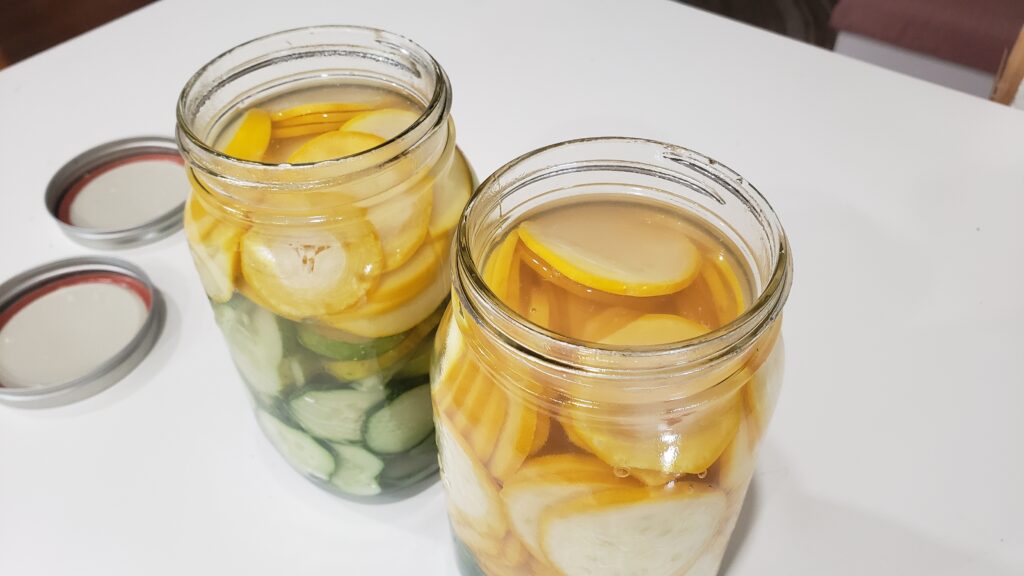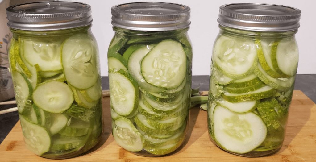 Traditional boiled/canned food can last on a shelf for years. But because this process doesn’t require the seal to be formed, this type of pickling doesn’t last as long. Also, the pickles must be refrigerated at all times so it’s important to keep them in the fridge. From what I’ve seen online, many websites suggest that quick pickles will last a few months. Personally, we pickle 12 jars of cucumbers, 1 for each month, to last us a full year until next pickling season. We have only had one instance where a jar fizzed upon opening that we had to throw out. However, we always do a smell test of the jars as they age to ensure they still smell fresh. It’s important to always trust your gut, and if they smell or taste weird – err on the side of caution and throw them out.