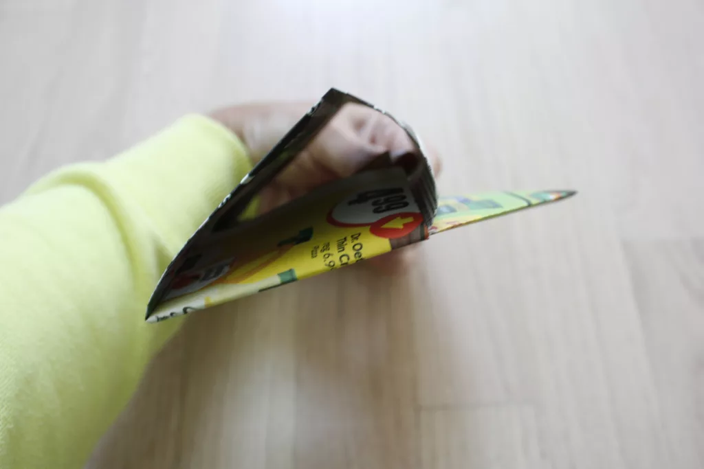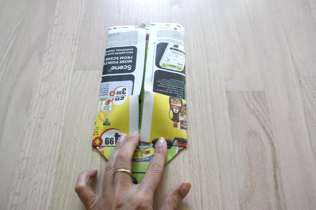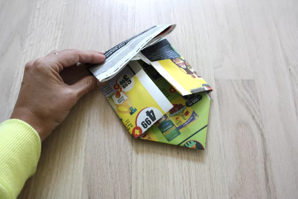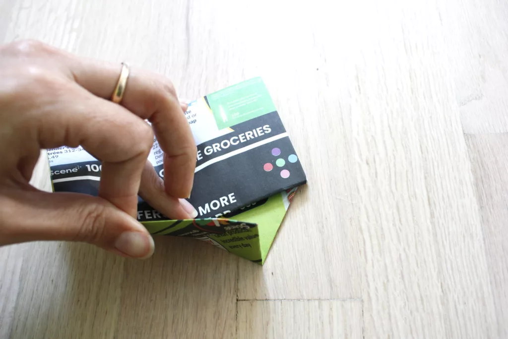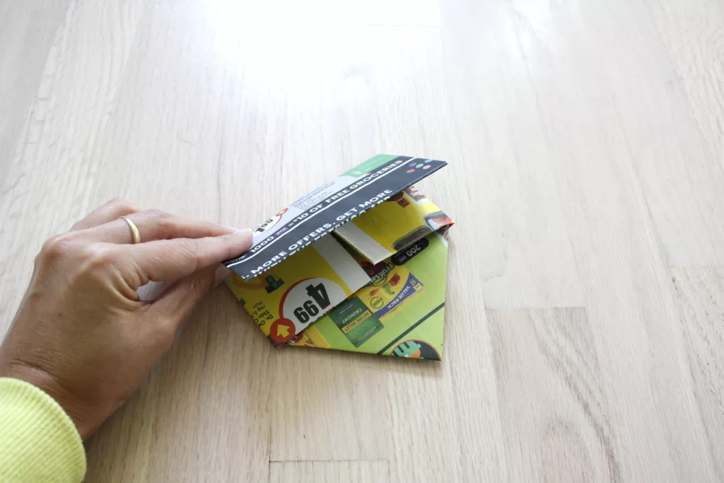 If you’re still with me, this is the tricky part. The top half of the flyer that you folded in the first part of step 5 needs to slide into the fold just above the point.