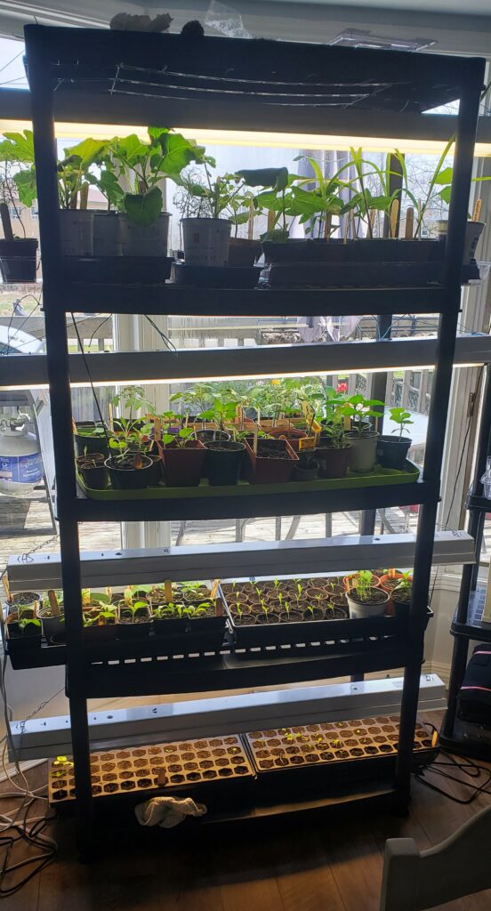 Here are some shelf recommendations based on current and past experience. I’ve included the description of the product, plus a link on where to find it. I prefer shelving units that are 48″ wide for our grow lights, as well as a stand made out of metal as I want it to stand the test of time, and also be recyclable at the end of its use. Listed below are shelves that would be a great addition to your seed starting journey.