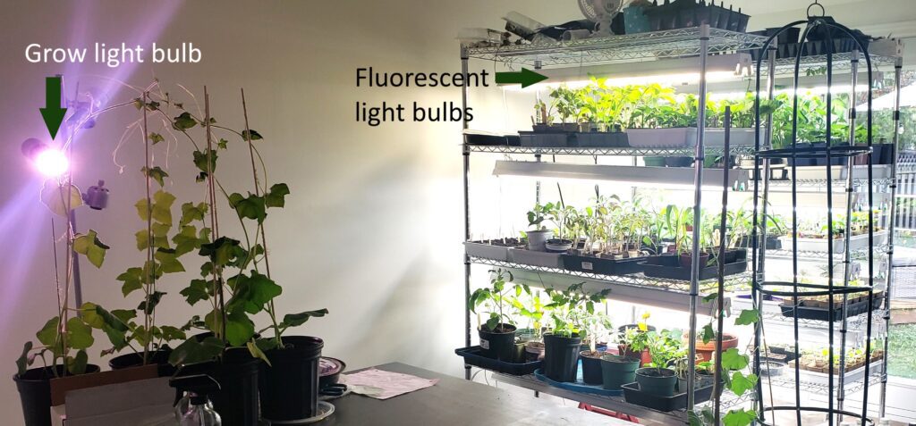If you’re using a shelving unit (vs a grow light setup), choose light fixtures that fit on the unit perfectly (ie 36″ wide or 48″ wide lights). I use commercial shop lights that hold 2 fluorescent lightbulbs because, at the time I bought them, it was the most affordable option. If you choose to use similar lights to my setup, you need a fixture that has space for two lightbulbs to get the full light spectrum (a warm and a bright light). If you buy lights that are specifically branded as grow lights, then you don’t need to worry about this.