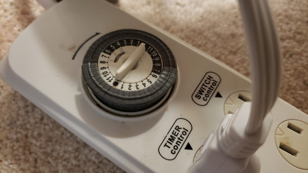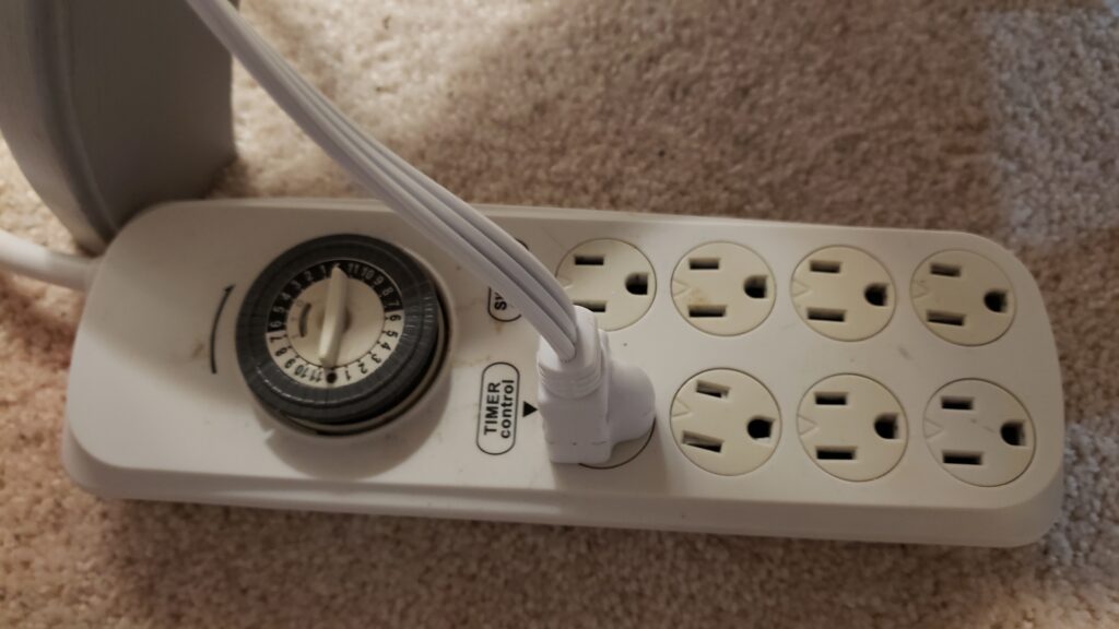 I prefer the extension cord with multiple outlets over a wall timer because generally there’s more than one light that is plugged in and needs to be turned on and off automatically. Often the extension cords have half the outlets timed with the other half always on. These work great so you can plug your heat mat into the always on outlets, and your lights into the timer outlet.